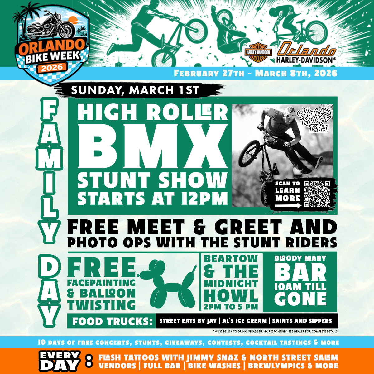FREE BMX Stunt Shows with High Roller BMX starting at noon & FREE Face Painting & Balloon Twisting from 1pm to 4pm